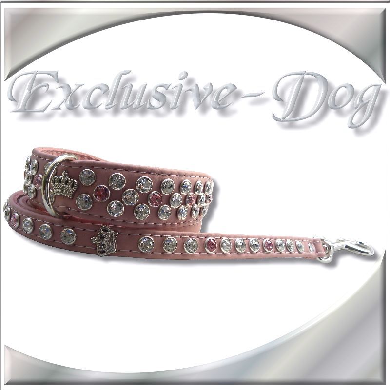 Rosa-Pink -farbenes Leine & Hundehalsband Strass Lederhalsband mit SWAROVSKI-ELEMENTS-Krone -für kleine Hunde Rassen z.b. Chihuahua